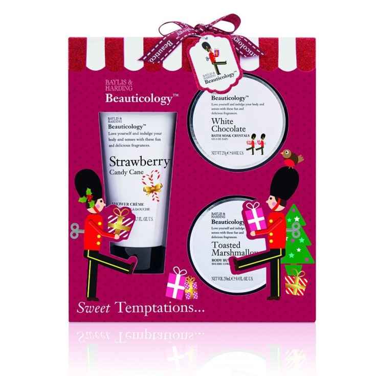 Baylis & Harding's Beauticology Toy Soldier Bathing Indulgence Gift Set contains three bath time treats and is the perfect pampering gift for anyone who enjoys a soak in the tub. The 250g White Chocolate Bath Soak Crystals help relieve any stress and tension, such as the 200ml Strawberry Candy Cane Shower Cream leaves the skin refreshed and revitalized. Marshmallow Toasted Body Butter 250ml helps lock in moisture for long lasting softness and silky smooth skin. With its striped and soldier gift box pattern, this is the perfect gift for the young or young at heart this Christmas.
