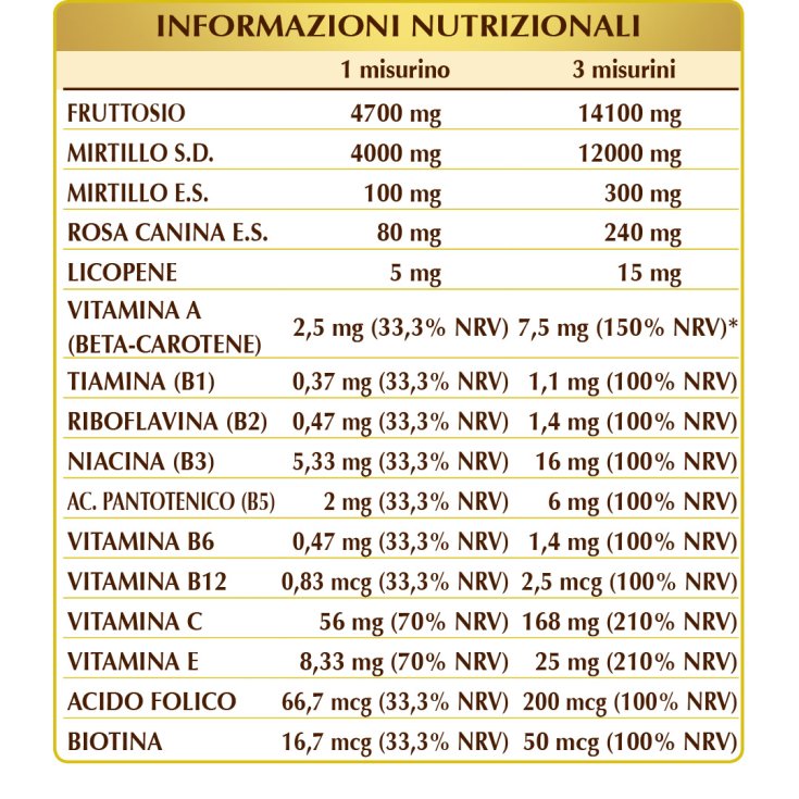 Fructose, bilberry (Vaccinium myrtillus) SD fruits, maltodextrin from corn or rice, bilberry (Vaccinium myrtillus) ES fruits (titrated to 25% in anthocyanosides), dog rose (Rosa canina) fruits ES (titrated to 70% in vitamin C ), tomato (Solanum lycopersicum) fruits ES (titrated 10% in lycopene), carrot (Daucus carota) roots ES (titrated to 10% in beta-carotene), vitamin E (DL-α-tocopheryl acetate), vitamin B3 (niacin), vitamin B5 (calcium pantothenate), vitamin B6 (pyridoxine hydrochloride), vitamin B1 (thiamine hydrochloride), vitamin B2 (riboflavin), folic acid, biotin, vitamin B12 (cyanocobalamin).
