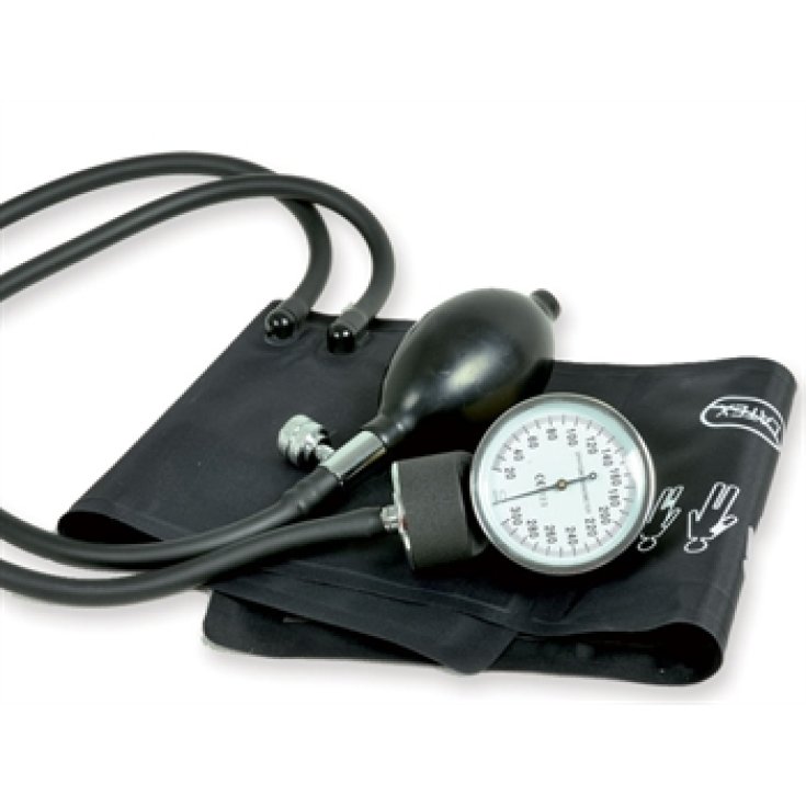 Sfigmomanometro classico con bracciale in nylon, chiusura velcro e manometro staccato agganciabile sul bracciale.Scala graduata da 0 a 300 mmHg. Regolazione manuale del rilascio aria possibile fino a 2/3 mmHg/sec. da 260 mm Hg a 15 mm Hg. Tempo deflazione max 10 sec. Scala graduata ogni 2 mm Hg. Zero flottante (il puntatore non presenta un punto di stop ma oscilla liberamente), bracciale in nylon con velcro, pera PVC con valvola cromata. Rubinetto aria cromato con regolazione rilascio aria tramite valvola a vite. Fornito con una borsa morbida in simil pelle con zip, in una scatola di cartone.