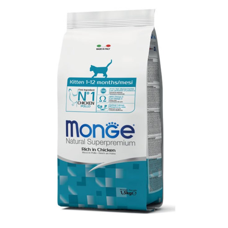 The Monge Natural Superpremium line ensures the well-being of the animal thanks to the correct balance of the essential nutritional elements. Complete food for kittens from weaning to the completion of their first year of age and for pregnant and/or lactating cats. Formulated with chicken meat as the first ingredient and with salmon oil, a source of omega-3 fatty acids, for the softness and shine of the coat. The formulation is enriched with XOS (xylo-oligosaccharides) and MOS (mannanooligosaccharides), prebiotics that support intestinal well-being.