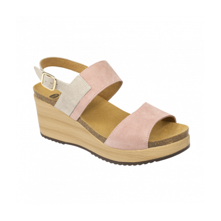 An absolute novelty for the Scholl Collection. An ultra-light wood-effect wedge, extremely modern and current. Elara is the new sandal featuring an ankle strap and a soft upper in bi-colored suede. Thanks to its ergonomic design, the insole with Scholl Bioprint® technology follows the shape of the foot and keeps it in the right position. The slip-resistant sole ensures stability and allows you to walk for a long time in total comfort.