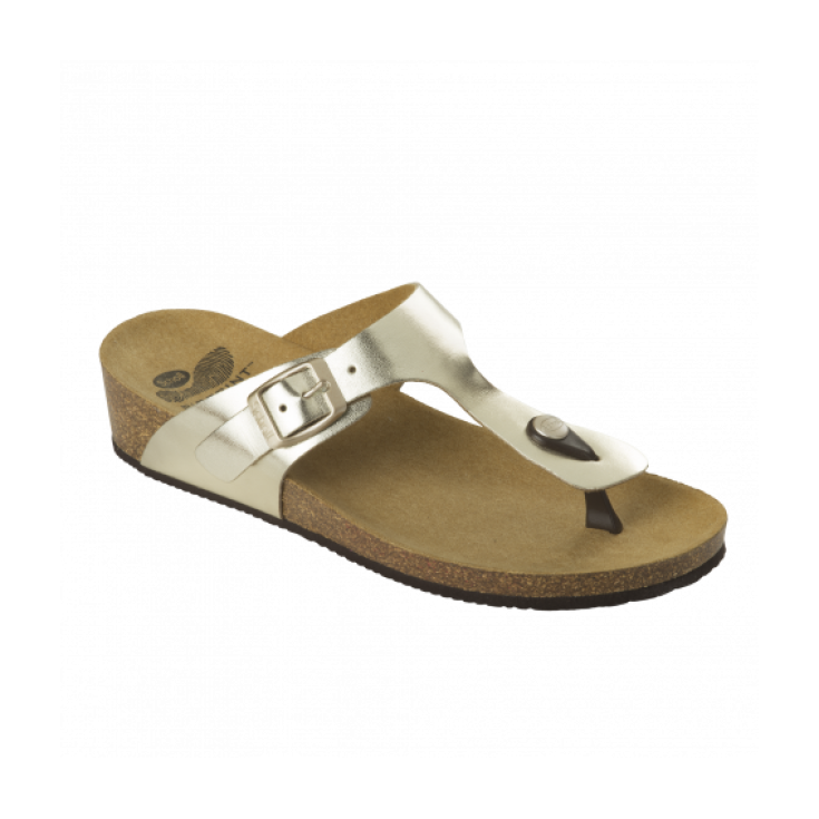 Gandia is flip-flops with Scholl Bioprint® technology equipped with the characteristic natural cork and rubber insole ergonomically designed to keep the foot in the right position. A comfortable and versatile model, characterized by a glitter upper that delicately embraces the foot. The buckle placed on the upper allows optimal adjustability to the foot