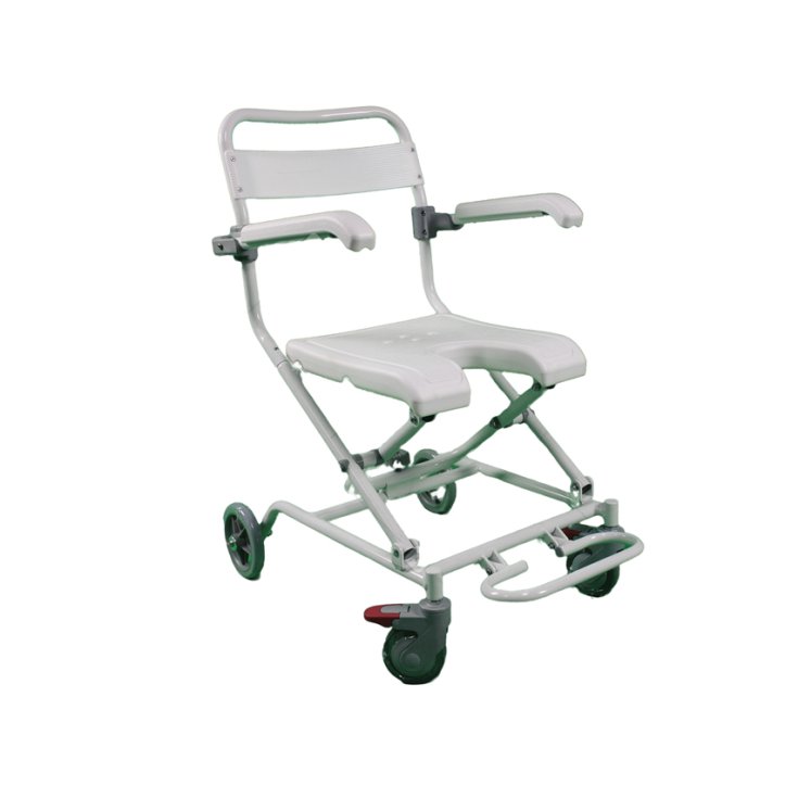 Folding shower chair on casters with aluminum structure and plastic seat. Folding armrests and lockable front casters.